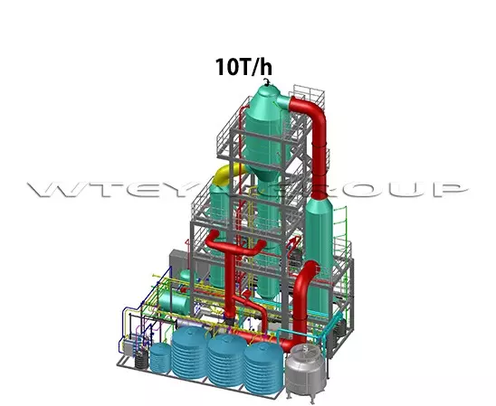 Der 10t/h Das MVR-Verdampfersystemnutzt Sekundärdampf als Wärmequelle und reduziert so den externen Energieverbrauch. Im Vergleich zu herkömmlichen Verdampfern kann der Energieverbrauch um 50 % gesenkt werden%–70%.